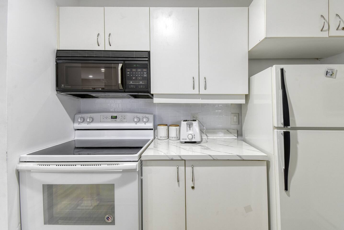 The kitchen features full-size appliances and all essential cookware, dishware, and utensils.