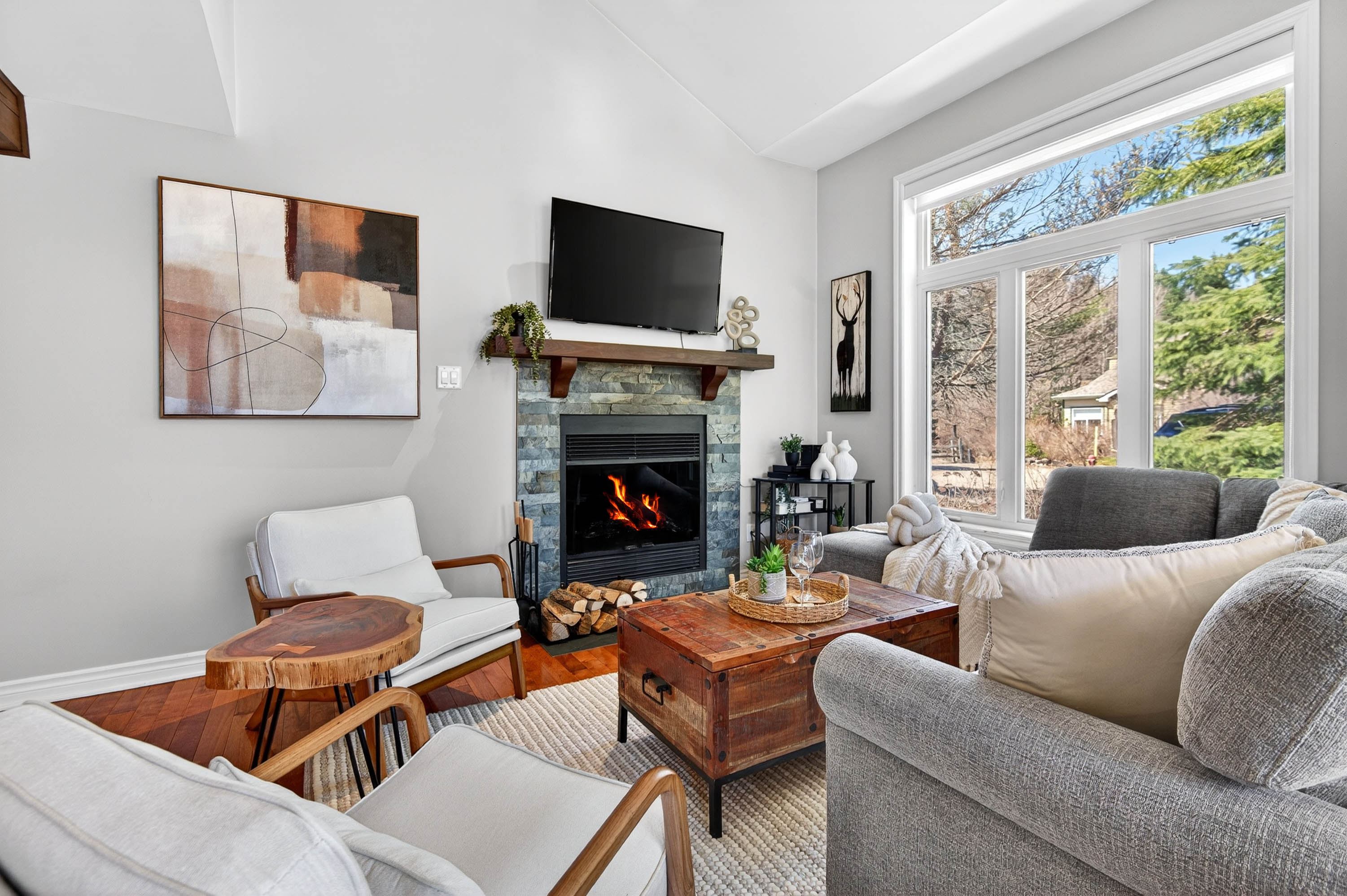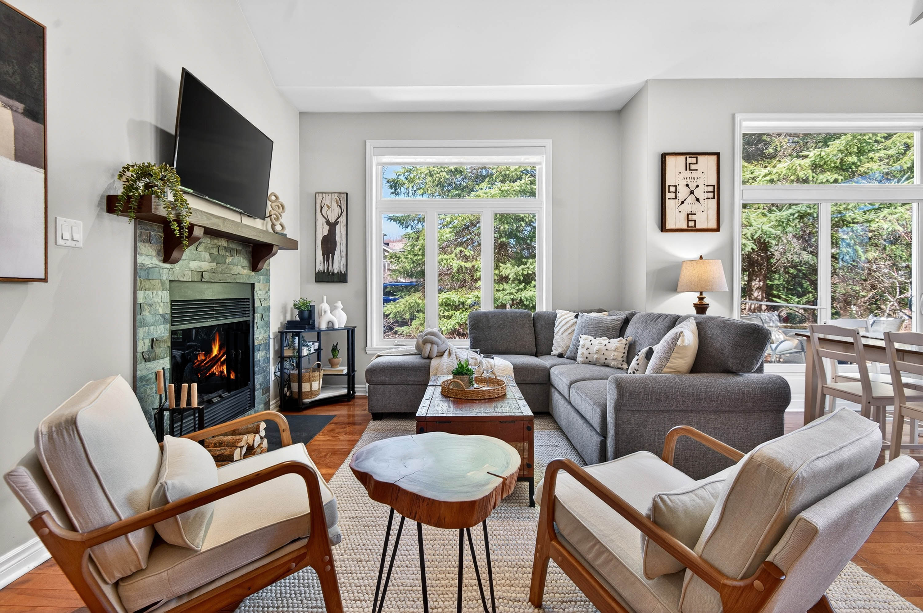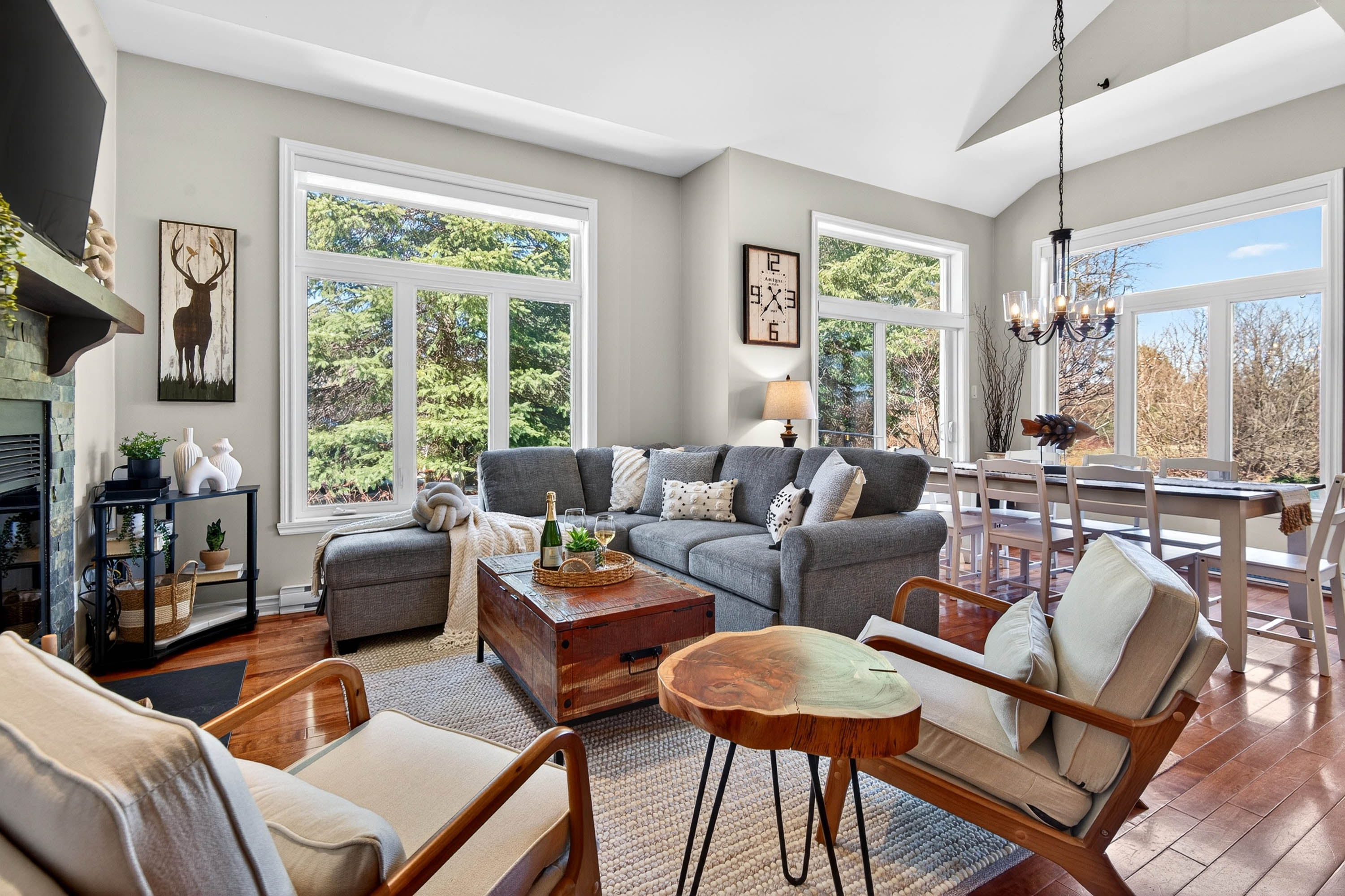 Bright and comfortable living space with large windows that bring in natural light and offer relaxing views of the surrounding area. The room features a TV with streaming in cozy seating, making it the perfect spot to unwind after a day of golf, hiking, or exploring Mont-Tremblant.