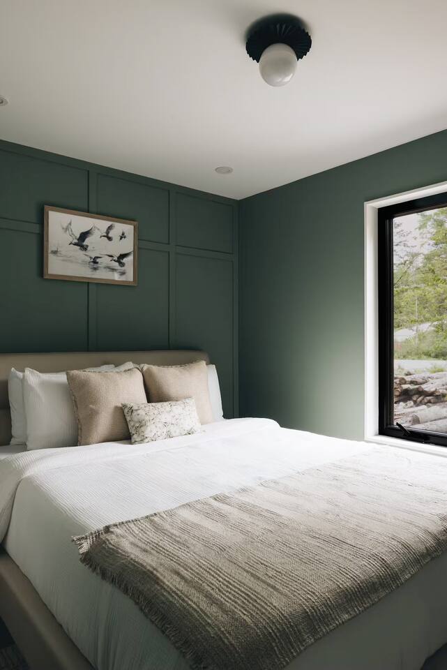 Serene green accent walls and a plush queen bed with soft linens create the perfect atmosphere for restful sleep.
