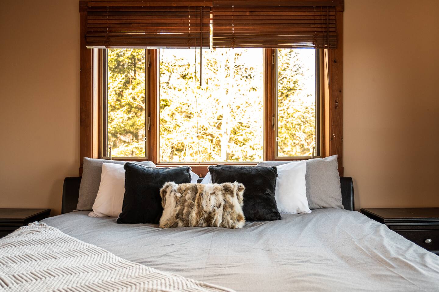 - Bedroom 1 with King Size bed, patio door with direct access to hot tub and firepit
