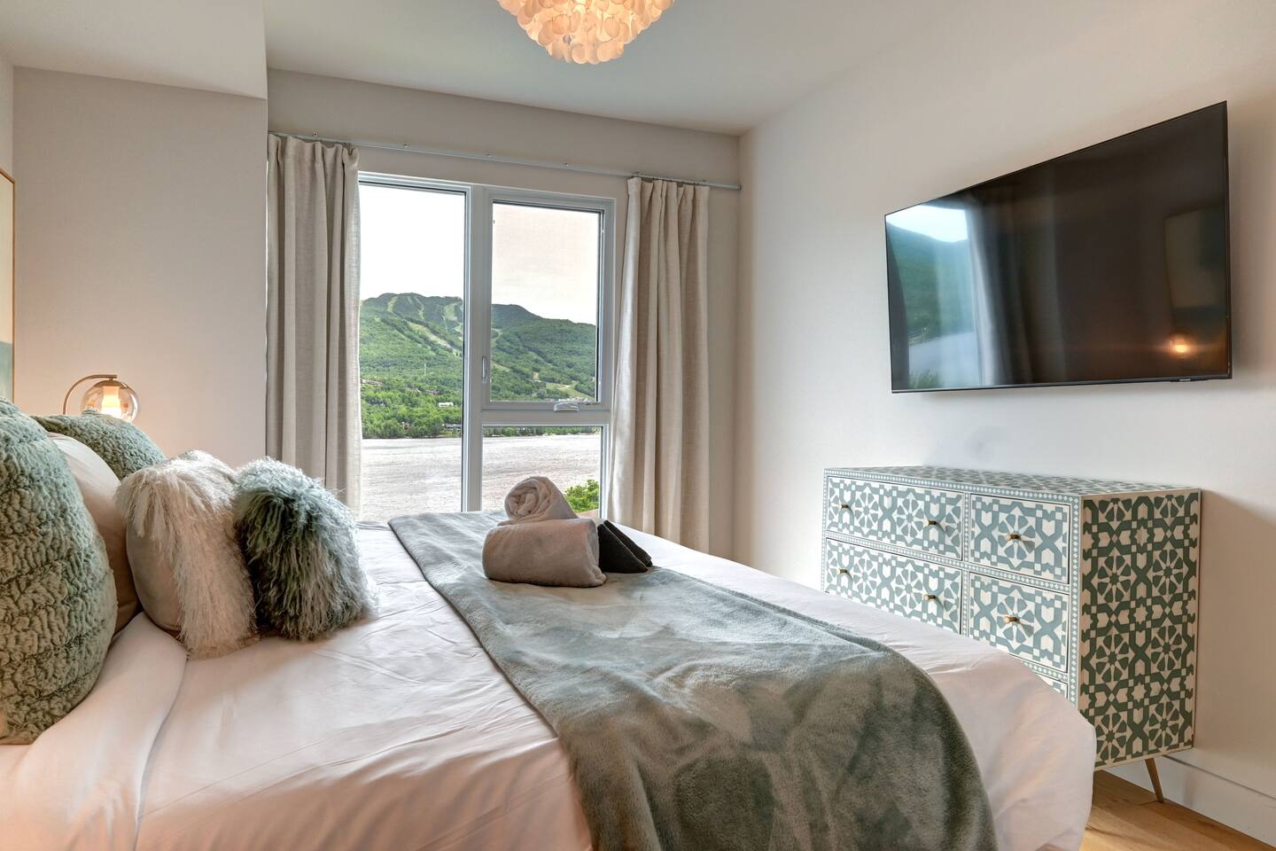Spacious open-concept design with high ceilings, expansive windows, and abundant natural light—offering breathtaking views of Tremblant Mountain and the lake. Entrance at the terrace level, with an elevator conveniently located right next to the condo for easy access to the gym and game room.